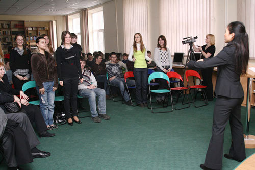 Сегодня - после двухчасовой поездки через горы, которые отделяют Симферополь от Ялты - я посетила Крымский Гуманитарный Университет. Ректор(эквивалент вице-президенту университета или, может быть, декану) был очень весёлый, очень здорово шутил и развлекал нас всё время, пока мы были там. У него однозначно очень хорошее взаимопонимание со студентами. Оказалось, что он ранее сам принимал участие в программе обмена - и был очень доволен этим опытом. Могу поспорить, там он тоже много шутил. Студенты, которым я была представлена, тоже были очень веселые. Помещение было набито битком, наверное больше 100 человек, и они задавали отличные вопросы. Я была удивлена, как много людей говорили на английском - это то, чего я уж не ожидала.