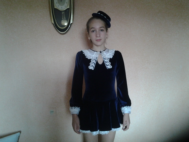 плечи-30, рукав-от плеча 54, по шву 45, от шеи до паха-55, от шеи до низа с юбкой-61, длина юбки-23, обх.тал.-50, обх.бёд.-58. Все замеры без растягивания ткани, платье хорошо тянется, девочке на фото вверху 12 лет (можно сказать впритык), шили платье на 9-10 лет (добавила фото с показательных выступлений).