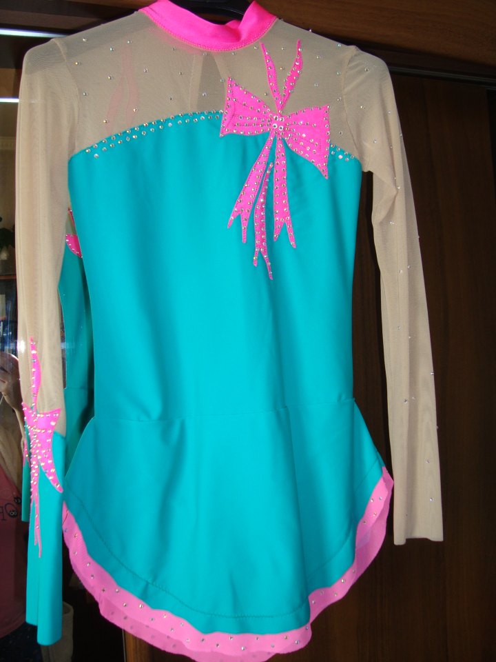 4.Бирюзовое с розовыми бантами на рост 135-140 см.