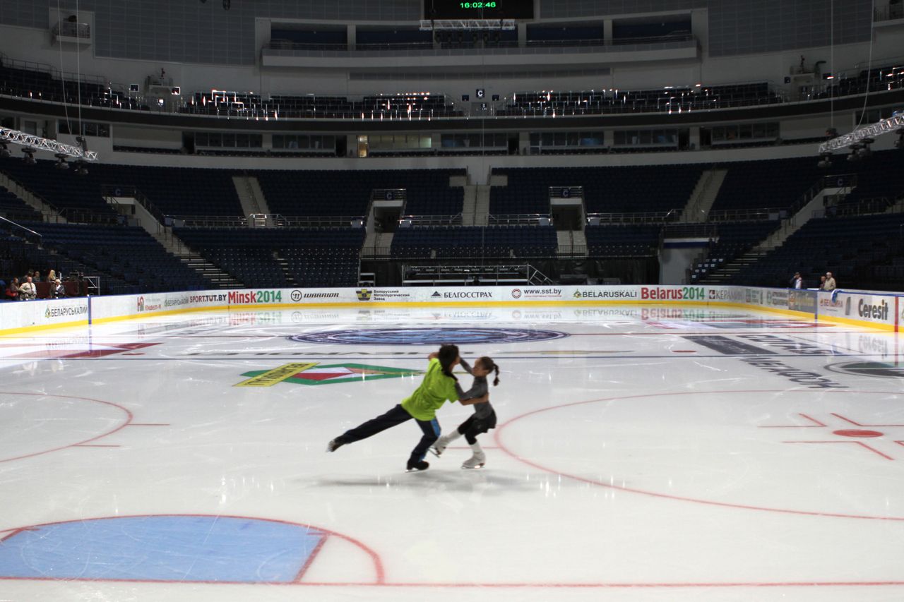 Украинские спортсмены благополучно прибыли в Минск - правда, к сожалению, не все - в танцах многие заболели и не приехали. Но одиночники наши все в сборе и сегодня провели первую тренировку. Что примечательно, так как тренировка была до жеребьевки, лед разделили не по группам, а по странам - в выделенное стране время, на главной арене катались только свои спортсмены.