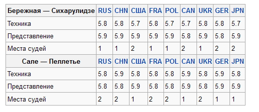 При всей моей любви к тому качеству и внешней эстетике, чистоте катания Бережной-Сихарулидзе, после сравнения программ приходится признать, что при меньшей эстетике, красоте, эффекте парности, чистоте скольжения, еффектных находок, Бережной-Сихарулидзе, у Сале-Пеллетье, явно более сложная программа, при более прагматичном катании.Т.Е. система 6.0. не готова была учесть - вместить в те самые 0.2..0.4 балла с одной стороны: сложность-качество-отсутствие ошибок, с другой стороны: хореографию-внешний эффект-качество скольжения-наполненность смыслом-уровень красоты танца.