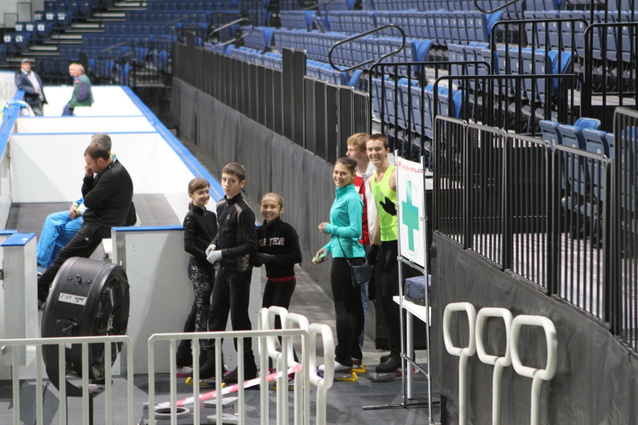 Украинские спортсмены благополучно прибыли в Минск - правда, к сожалению, не все - в танцах многие заболели и не приехали. Но одиночники наши все в сборе и сегодня провели первую тренировку. Что примечательно, так как тренировка была до жеребьевки, лед разделили не по группам, а по странам - в выделенное стране время, на главной арене катались только свои спортсмены.
