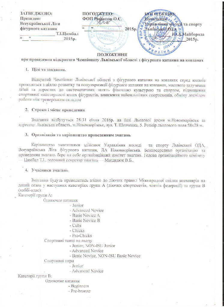 Могу сказать, что у меня нет просто комментариев. Я еще большей лжи не слышала. Я работаю с Винницким городским советом, со Львовской государственной администрацией, с Ивано-Франковской государственной администрацией, с Калушским городским советом, с Тернопольским городским советом, провожу соревнования для развития и популяризации фигурного катания, и ни разу я себя не ассоциировала с федерацией фигурного катания, просто даже по причине того, что мне три года назад это стало неинтересно, когда президент федерации стал требовать от организаторов коммерческих стартов деньги за проведение себе в карман. Мы все отказались и это всего лишь последствия этого отказа. Я не хочу даже представлять совместную работу с данным человеком, который вогнал фигурное катание в яму, продает налево и направо спортсменов. объявляя их неперспективными, проводя заказные Кубки нашего двора. Я не хочу работать с таким президентом и такой командой. Я ниже выложу сканкопию положения с печатями и хотелось бы понимать где там написано, что я Федерация фигурного катания. Свои слова надо подтвержать, а не сотрясать ими воздух на проплаченой конференции. Все иностранцы, которые приезжают к нам для участия в соревнованиях привозят разрешение от национальных федераций (в конституции ИСУ очень четко данный пункт прописан). Зато на мои вопросы господин Ларин не ответил, а хотелось бы очень знать на них ответы: 1. Зачем вы стараетесь заставить любителей быть членами федерации? Что это дает? И как объяснить любителю за что он платит взносы в федерацию? 2. Почему в Украине проводятся соревнования не по правилам ИСУ, а единственные старты по данным правилам под запретом? 3. Почему вы игнорируете уже три года просьбу всех западноукраинских регионов о создании отделения федерации, а когда там начала работать Всеукраинская Лига фигурного катания Вы активно начали гадить организации и дискридитировать ее работу в Управлениях физической культуры и спорта? 4. На каком основании (ссылка на документ - Устав Федерации в данном случае не документ о подтверждении таких полномочи ввиду что Всеукраинская Лига имеет такой же устав как общественная организация) Вы запрещаете Управлениям по физической культуре и спорту проводить областные первенства по фигурному катанию (это касается не всеукраинских и международных стартов)? 5. В конституции ИСУ четко озвучено,если национальная федерация подписывает разрешение на участие своих спортсменов в комерческом старте, то на каком основании Вы запрещаете иностранцам принимать участие в стартах Всеукраинской Лиги фигурного катания? 6. На каком основании я и другие организаторы комерческих стартов обязаны лично Вас оплачивать на карман энную суму за проведение таких стартов? Хотя аетестованых судей, бригаду и других официальных лиц от федерации мы оплачиваем. (ЭТО ЕЩЕ И К ВОПРОСУ ВЫШЕ О СОМНИТЕЛЬНОМ СУДЕЙСТВЕ - У НАС СУДЯТ ТЕ ЖЕ АТЕСТОВАНЫЕ СУДЬИ, ЧТО И КУБКИ УКРАИНЫ) 7. Куда уходят стартовые взносы с Ваших стартов, если лед Вы требуете от организаторов бесплатно (за который кстати любительские старты оплачиваю, просто для сведения), вся судейская система бесплатно, и.т.д.? 8. Да, и последний вопрос - почему Ваши решения всегда безаргументны - я так хочу - у Вас комплекс Бога?